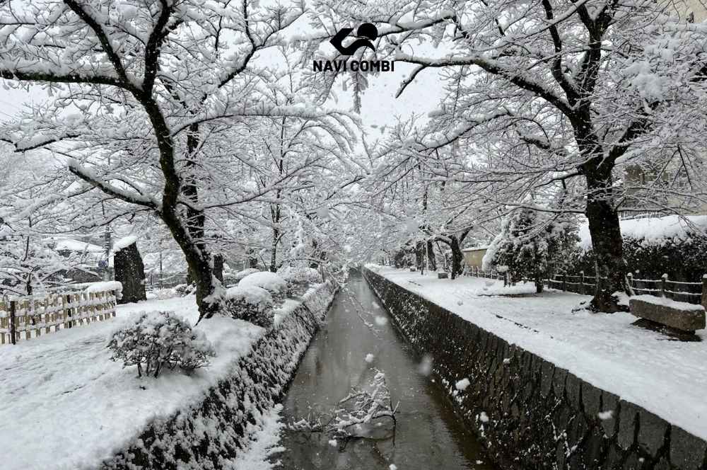 Đông tới, Tetsugaku no Michi thu mình trong vẻ trầm mặc vốn có. Không còn hoa cũng chẳng còn lá, chỉ còn những cành cây khẳng khiu vươn mình trong làn sương mờ hay dưới lớp tuyết mỏng.Trong cái lạnh thanh khiết, mỗi bước chân đều đưa ta về gần hơn với bản ngã và sự tĩnh lặng tuyệt đối.